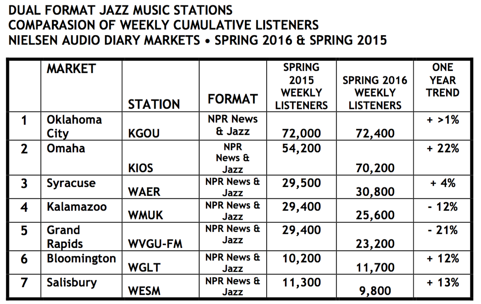 methodology. Each of the Diary market Jazz stations have a different approach to the music. KGOU, Oklahoma City airs lots of Blues. WAER, Syracuse has a more traditional music mix.
